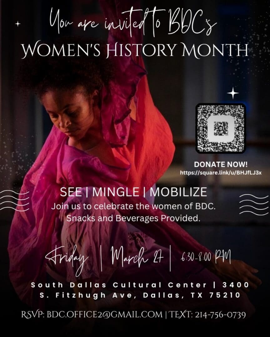 South Dallas Cultural Center 3400 S Fitzhugh Ave, Dallas, TX, United StatesBeckles Dancing Company will be celebrating Women's History Month with an Open Rehearsal (Sip-and-See), featuring excerpts of the upcoming repertory and tidbits about some of the women in Loris' Dance History.